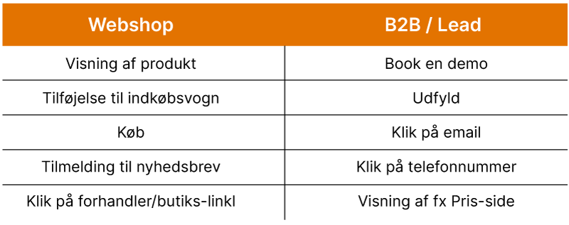 De vigtigste konverteringshændelser - fx køb af et produkt på en webshop eller udfyldelse af kontaktformular for en B2B-virksomhed - skal du eller dit CMS selv lave.