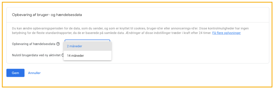 I dine indstillinger har du mulighed for at vælge en “data retention” periode. Denne er som udgangspunkt indstillet til blot to måneder, men du kan så nemt som ingenting indstille den til at gemme data i 14 måneder. Hvis du da kender til indstillingen!